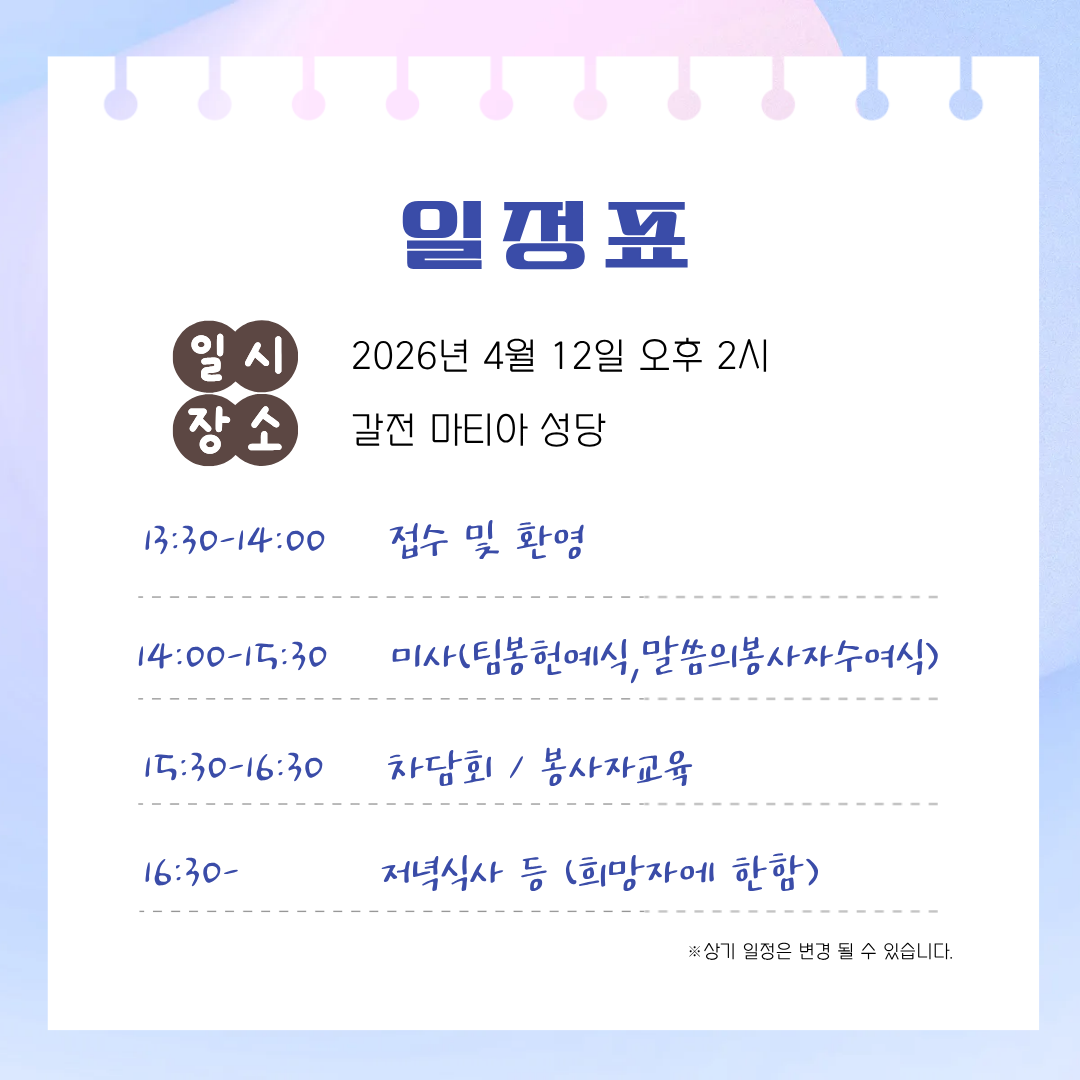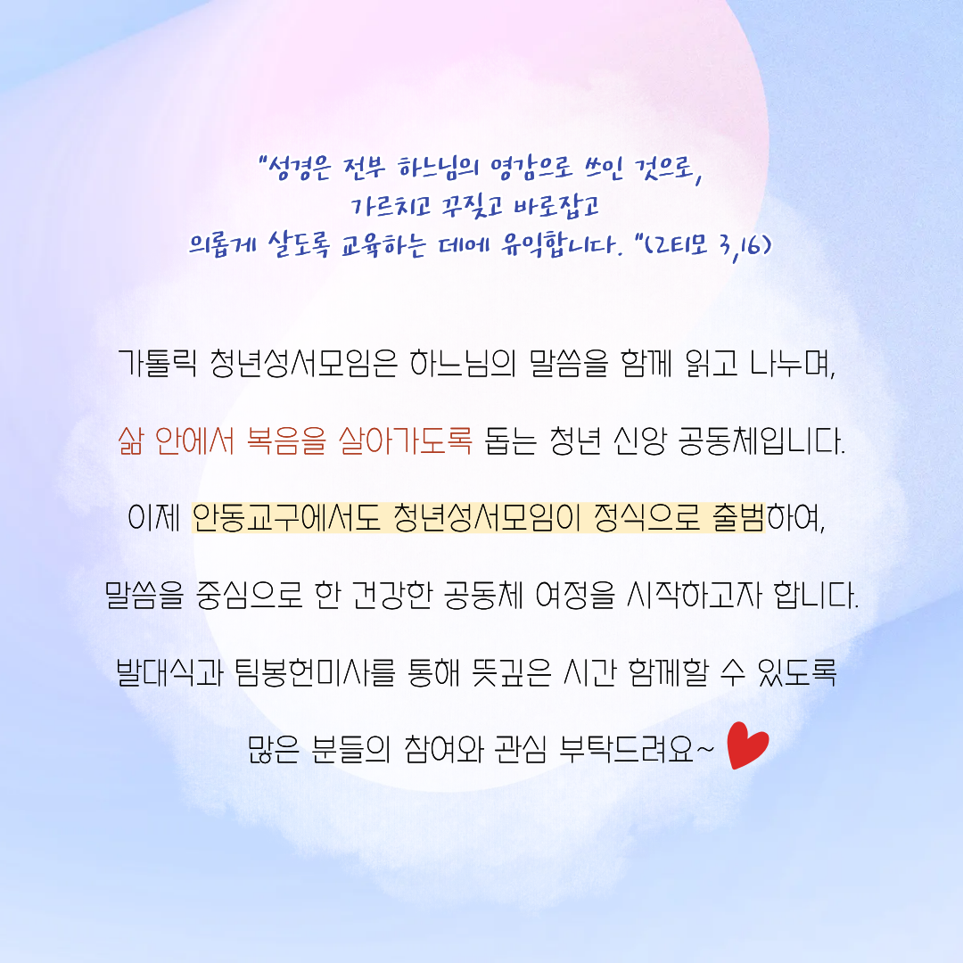 안동교구 청년성서모임 발대식 및 팀봉헌미사 안내